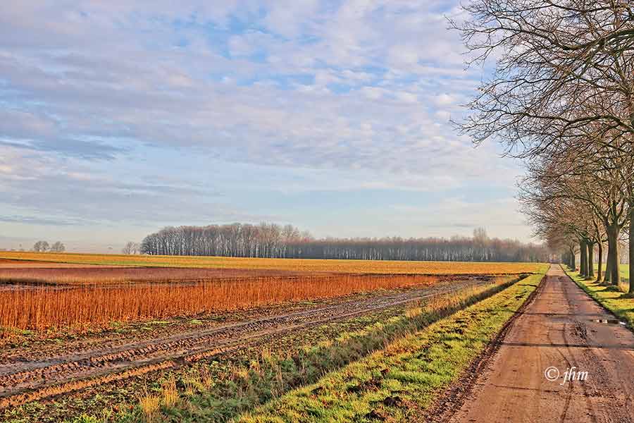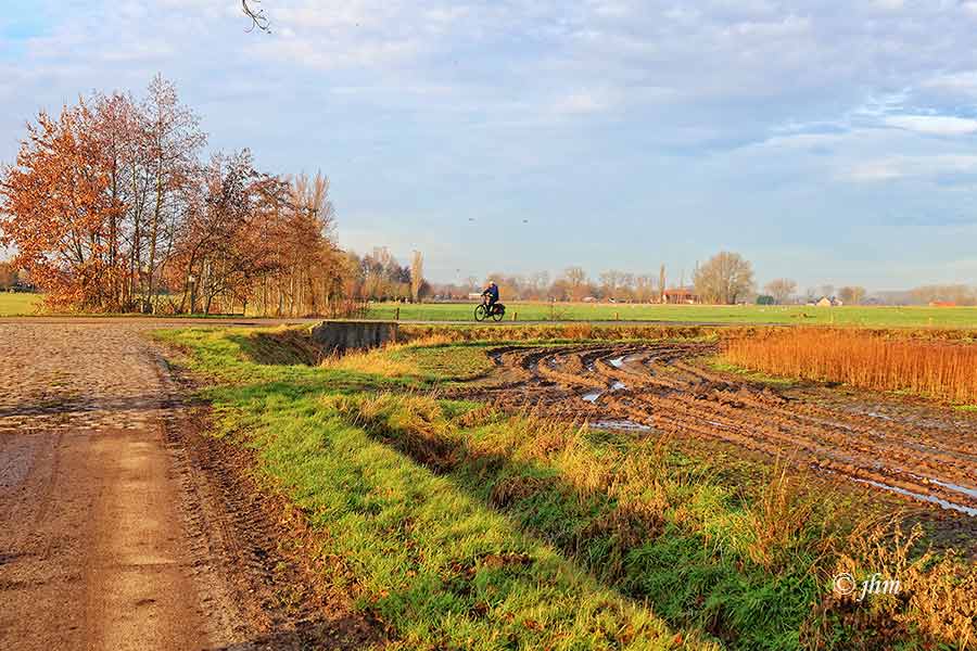 Adegem – Perenboom en Blekkersgat, zondagvoormiddag: 5°C, opklaringen en wolkenvelden, 2Bft oostenwind. Vele wielertoeristen hebben de fiets van stal gehaald.