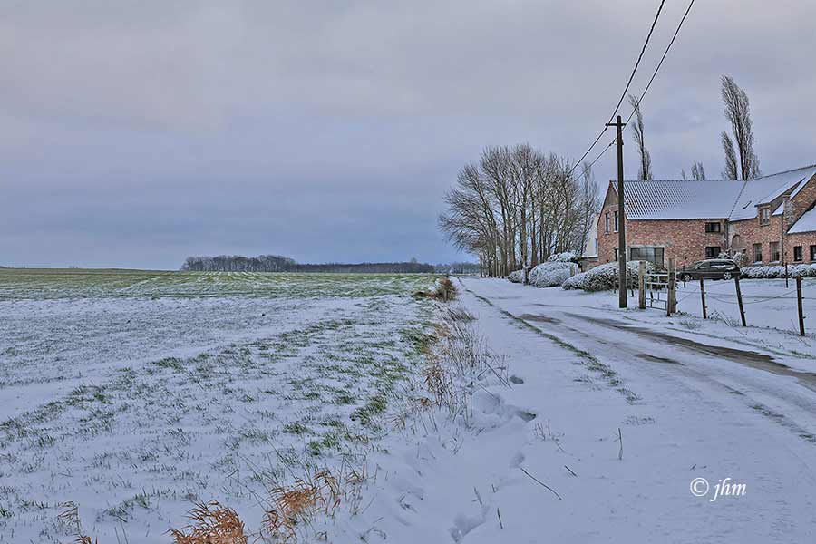 Donderdagvoormiddag te Adegem (Zandakkers): 2°C, rustig winterweer met de restanten van de sneeuw van gisteren, 2Bft zuidenwind. Opgelet: niet alle wegen zijn ijsvrij!