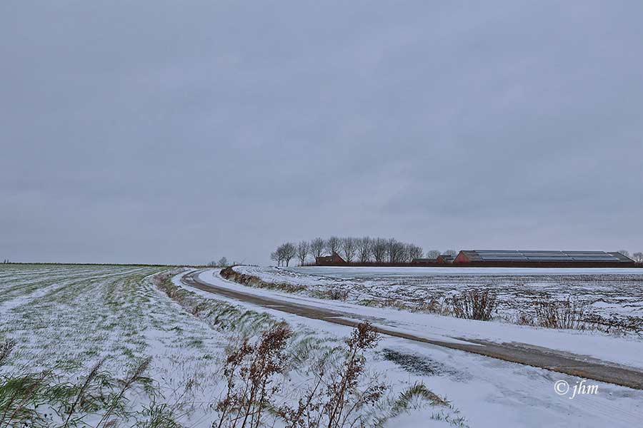 Maldegem tijdens de voormiddag: +1°C met een flinke sneeuwbui, 2Bft zuidwestenwind. Buiten mooi poëtisch maar soms glad met de fiets.