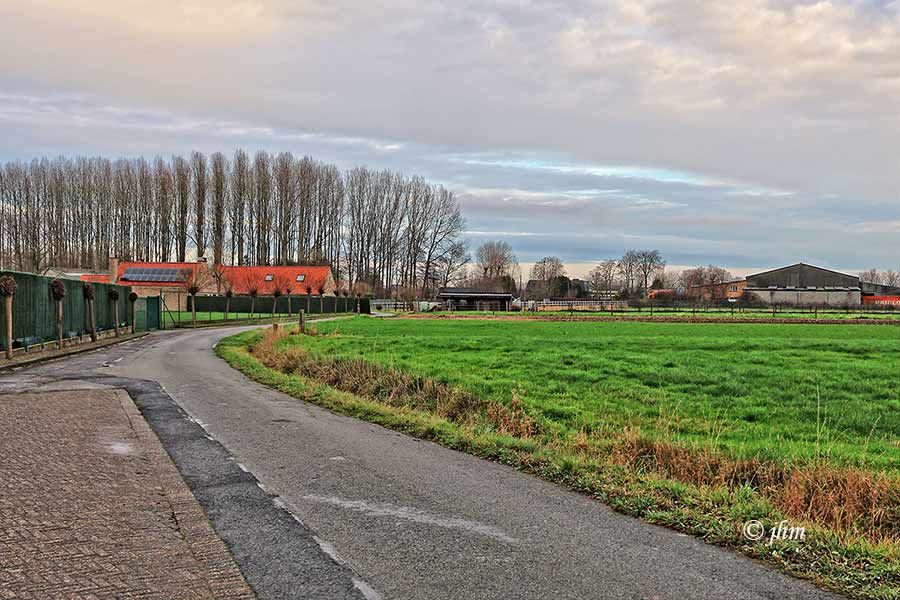 Adegem, zaterdagvoormiddag aan de Gentweg: 4°C, ochtendmist boven de velden, de zon probeert door te breken. Buiten sporten kan, mits goede outfit…