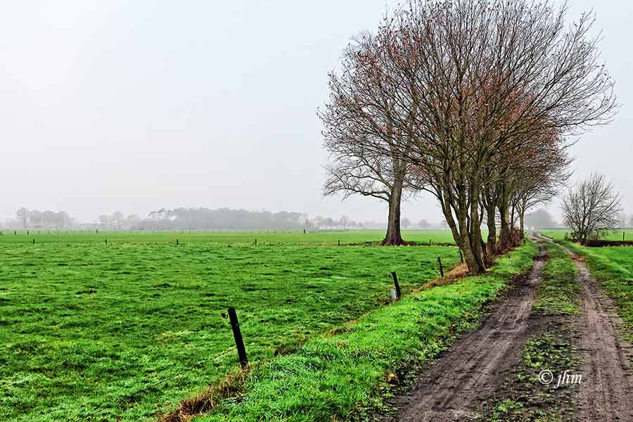 Maldegem, zaterdagvoormiddag in Butswerve: 7°C, lichte mistbanken, nevelig maar weinig wind. Goed voor buitensporten zoals wandelen en fietsen.