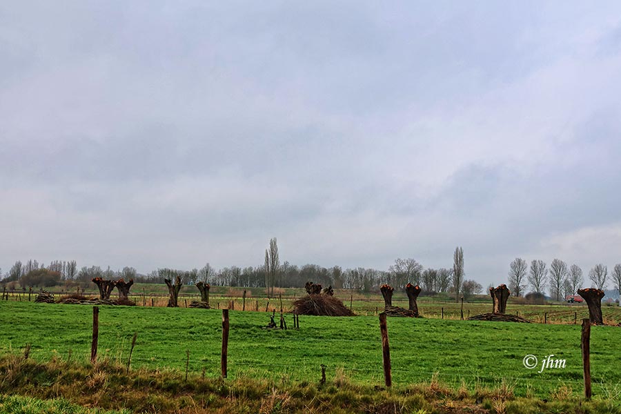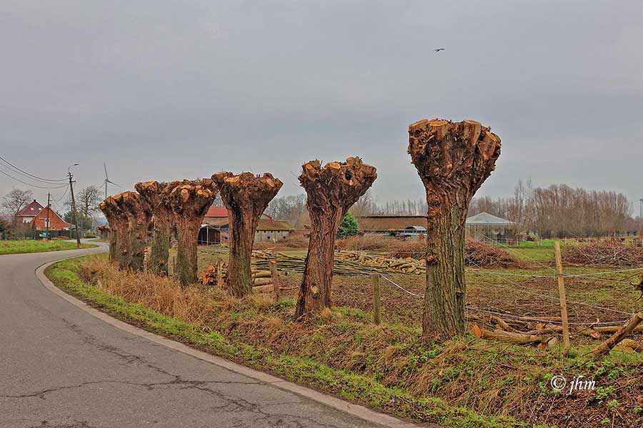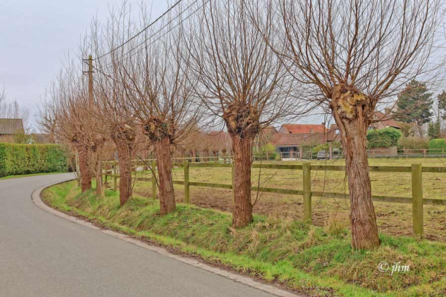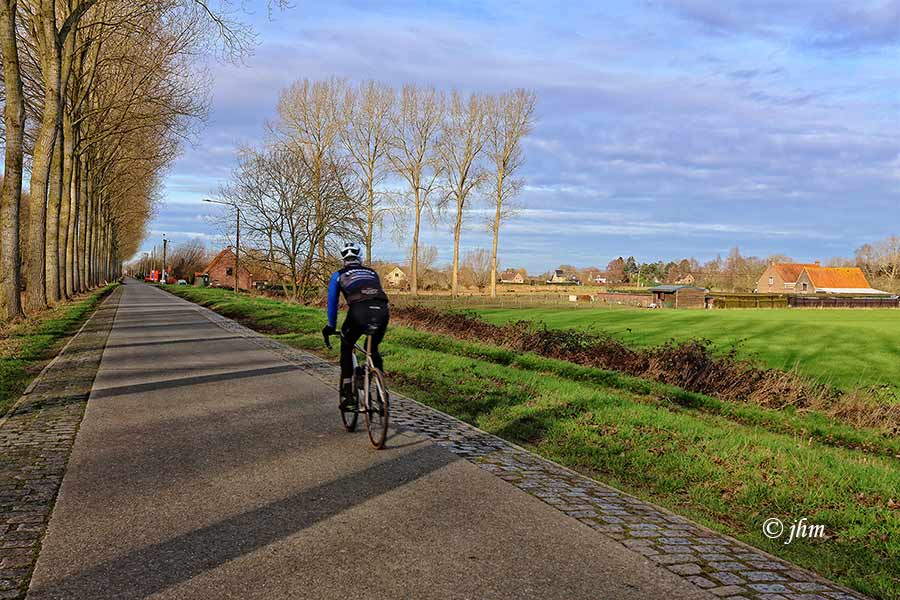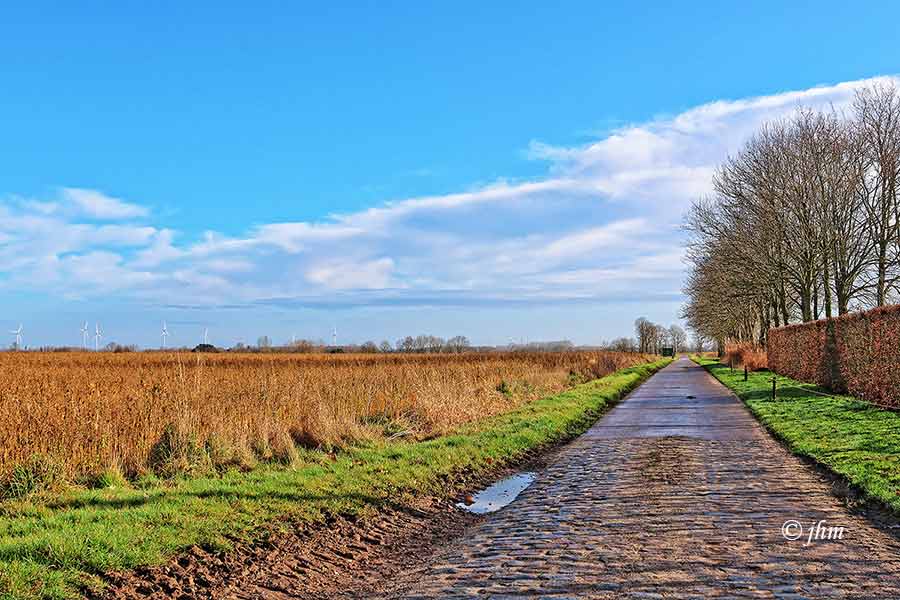 Maldegem, maandagvoormiddag in de Radestraat: zwaarbewolkt en 5°C, zeer koud aanvoelende 3Bft zuidoostenwind. Wandelen kan, mits goede outfit.