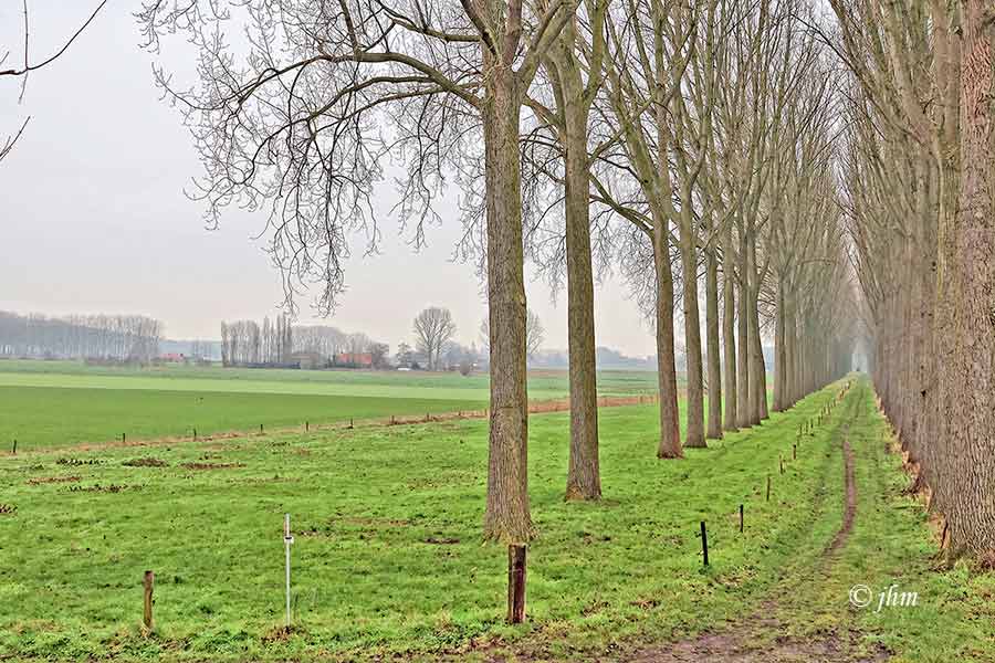 Zondagvoormiddag te Maldegem-Strobrugge: +1°C, zwaarbewolkt, lichte grondvorst, 2Bft zuidoostenwind. Goed weer om te wandelen en te lopen, maar voor fietsers is het bitter koud.