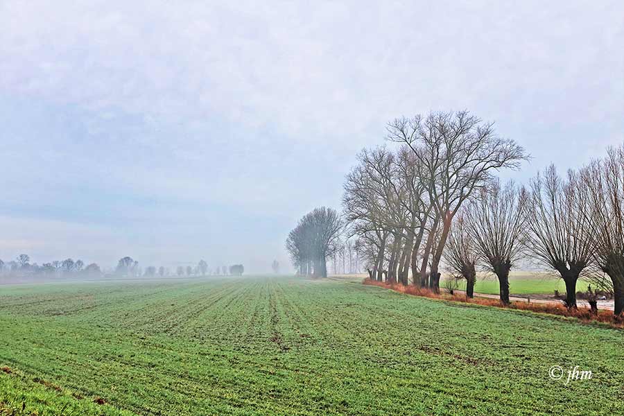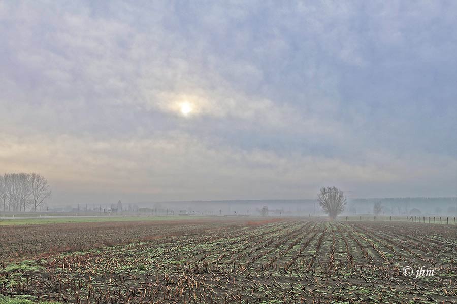 Maldegem, woensdagvoormiddag: 3°C, lichte mist hangt over de velden maar de zon probeert. Geen wind. Lopen en wandelen geen probleem, om te fietsen is het wat frisser.